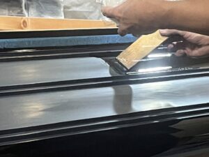 塗りを終えると、再び炭で研ぐ。研ぎと塗りと乾燥をくり返すことで、本漆独特の奥深さが生まれる。