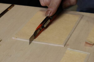 下絵のアウトラインに沿って「金のこ」を入れて、金具の形を整えていく。