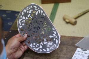 制作中の金華鬘。下絵通りに透かし文様を入れていることが分かる。
