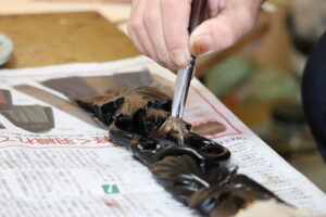 加えて、塗りと研ぎをくり返すことで生み出される奥深い光沢は他の塗料では真似ができず、さらに強固な接着力を持つことから、仏具の表面の仕上げだけでなく、金箔や蒔絵の接着剤としても利用されています。