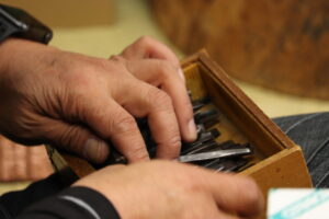 錺金具の命ともいえる鏨。箱の中に保管される無数の鏨の中から、素早く一本を選び取る。錺金具師の頭の中で、出来上がりのイメージと使うべき鏨が瞬時につながっているさまを見た。