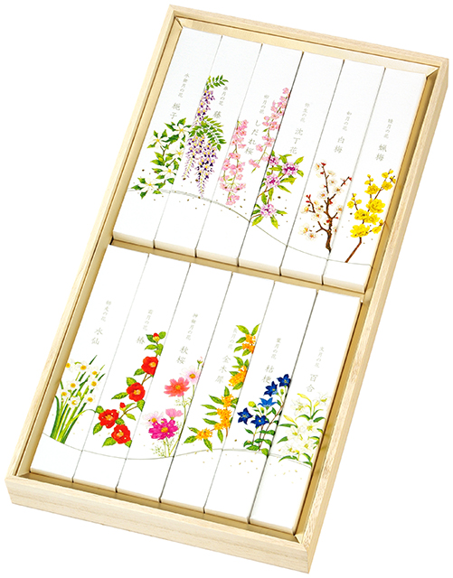 このお線香の一番の特徴は、四季の移ろいを香りで感じられること。1月の「蝋梅」から12月の「水仙」まで、それぞれの季節を代表する花の香りが詰め合わされています。