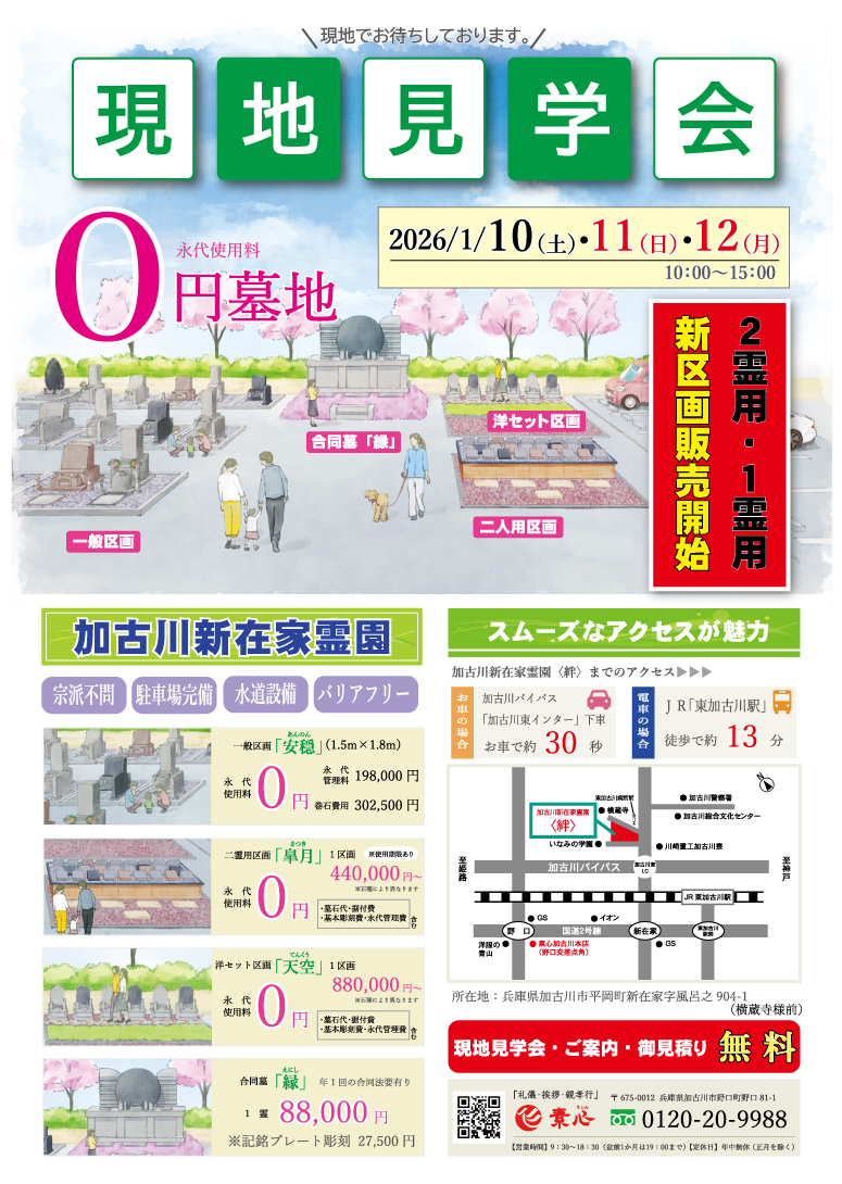 加古川新在家霊園現地見学会のお知らせ 2025.12.18 | 加古川新在家霊園では新区画完成に伴い、現地見学会を実施いたします。 ご検討の方は是非一度お立ち寄りください。 2026年1月10日(土)・1月11日(日)・1月12日(月) 3日間開催予定! « 前へ一覧へ