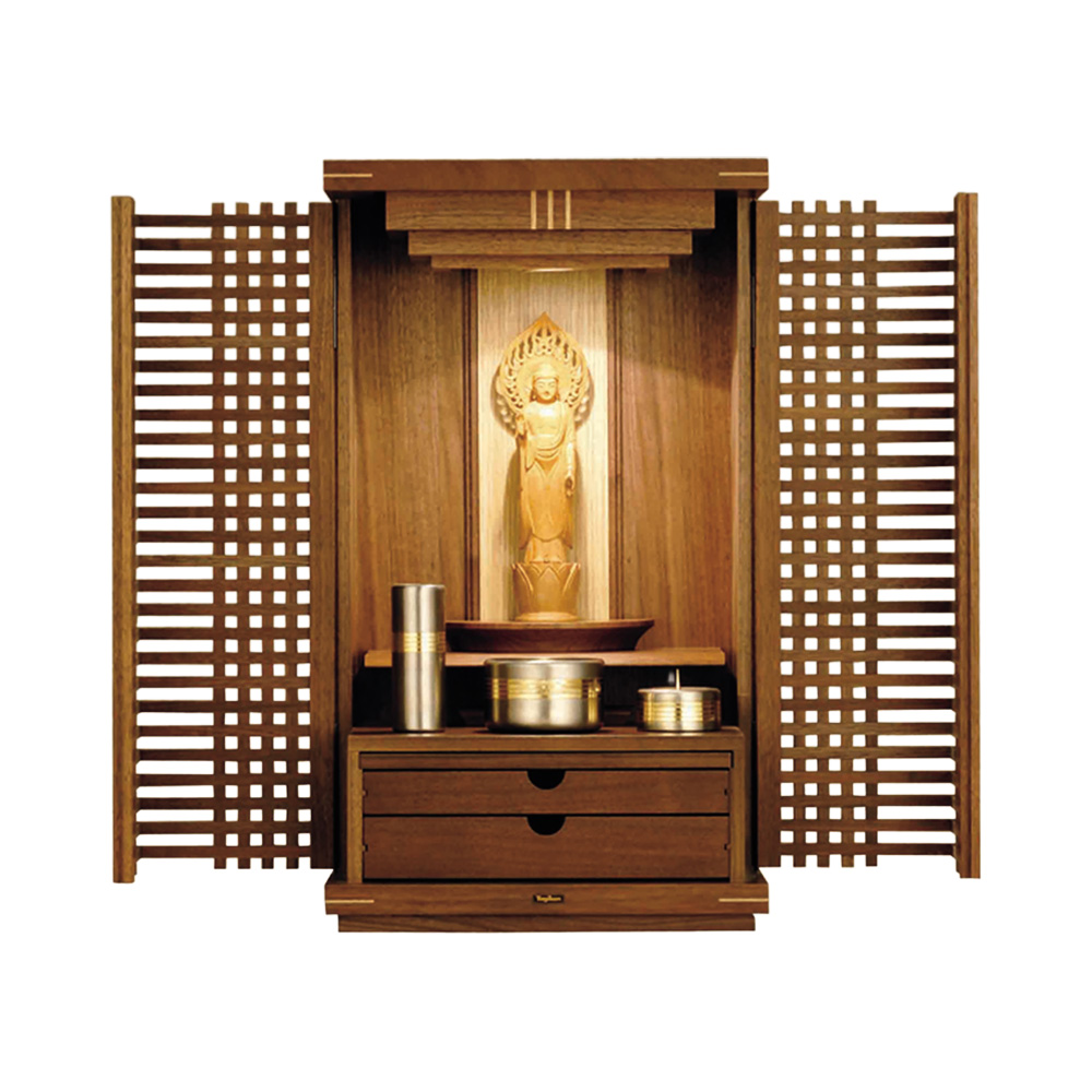 現代仏壇ラティス 500,000円 (税別) 高さ62cm × 幅35.6cm × 奥行35.6cm(重さ:約12kg) 芯材 ウォールナット ナラ 塗装 ウレタン塗装 原産国 日本製 « 前へ一覧へ 次へ » その他の家具調 家具調 唐木仏壇 金仏壇 手元供養 仏壇一覧 ライフ 離宮 パッサート モンド